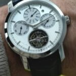 Despite it not being visible, the movement is lavishly finished with circular Côtes de Genève, circular-grained mainplate, bevelled bridges, and blued screws.