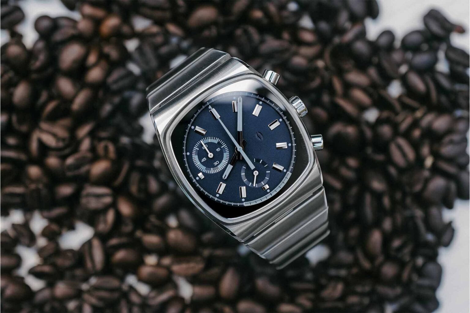 For the Teddy Baldassarre Edition of the Metric, Teddy and Jonathan have chosen to experiment with tones of blue. The dial is a dark, nearly navy shade of blue, and the tone alternates from light to dark across the subdials and handset.  There are a number of other little details on this edition that have been tweaked from standard versions of the Metric, including a redesigned handset (these are thicker, more prominent fence post style hands), a sunken register at 6:00, and the removal of the date window entirely. Other elements of the Metric that we’re more used to are held over here to varying degrees, including the “hidden” brew logo (which appears at 3:00 on this edition) and the espresso shot timer indication between 25-35 seconds, right below 6:00 (here it’s in a hard to miss high contrast white).