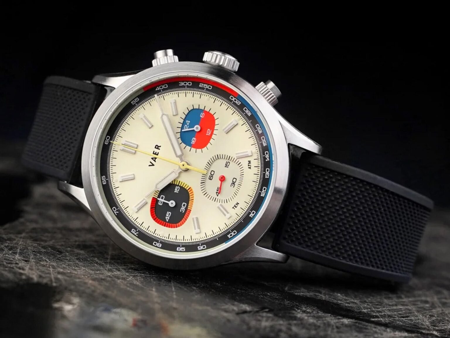 Vaer founders Ryan Torres and Reagan Cook pooled their collective life savings to start their own watch brand because “we couldn’t afford the watches we liked and didn’t like the ones we could afford.” Based in Venice, California, Vaer released its first watches, assembled overseas, in 2017, and began manufacturing in the U.S. just one year later. The RS1 Rally Chronographs take their cues from timepieces worn by race car drivers in the 1960s and ‘70s and hit the accessible price point the brand strives for thanks to their use of a VK63 mechaquartz movement. The 40mm steel cases are offered on a series of interchangeable straps and bracelets, in dial colors of black or cream. The subdials for running seconds and chronograph readouts are TV-shaped rather than round, making for a charmingly odd contrast with the case and dial, and highlighted with bright colors that echo those found in the dial’s tachymeter scale.