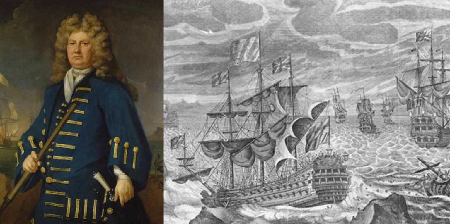 Sir Cloudesley Shovell, by Michael Dahl, about 1702-5 (L); The Association with the Eagle, Rumney and the Firebrand, Lost on the Rocks of Scilly, October 22, 1707 (R). Image courtesy of the © National Maritime Museum, Greenwich, London