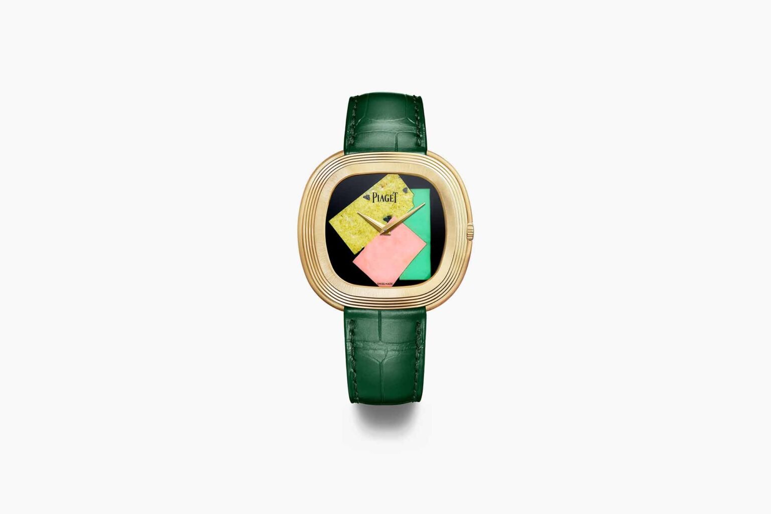 The result is a watch that tells the story of the collaboration between Piaget and the Andy Warhol Foundation as it is about simply creating a unique watch. The dial motif of the Andy Warhol Watch Collage Limited Edition comes from the application of four ornamental stones, shaped, cut, and arranged using the Métier d’Art of marquetry. The base is black onyx, the same color as Andy Warhol’s own Piaget watch from 1973. This is complemented by thin slices of yellow Namibian serpentine, pink opal, and green chrysoprase.