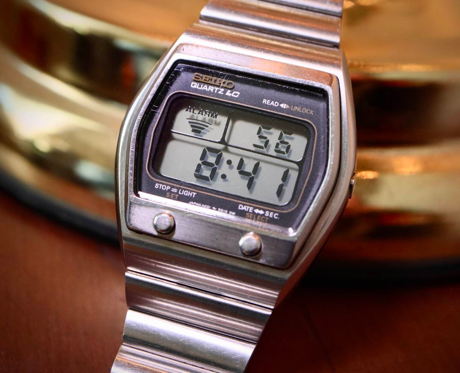 Equally as timeless as its alarm function is the A031-5019’s overall looks. Constructed of an all-stainless-steel case and bracelet, it both runs and feels like a workhorse of a watch. With a 37mm diameter and thickness of only 12mm, it’s a great and slim wear. The chiclet bracelet is such a gem and truly completes the entire look when paired with the geometric case shape. Another selling point to many of these early digital timepieces is the strong contrast of the LCD screen if the watch was properly preserved and maintained throughout its life. The numbers jump out at you when you look down at them, and the shadows the digits cast on the screen’s backing are unrivaled to today’s digitals.