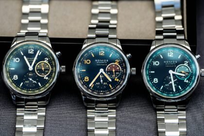 The dials feature applied hour markers and faceted Dauphine hands with white luminescent material. The date is displayed in a small aperture at 3 o’clock.