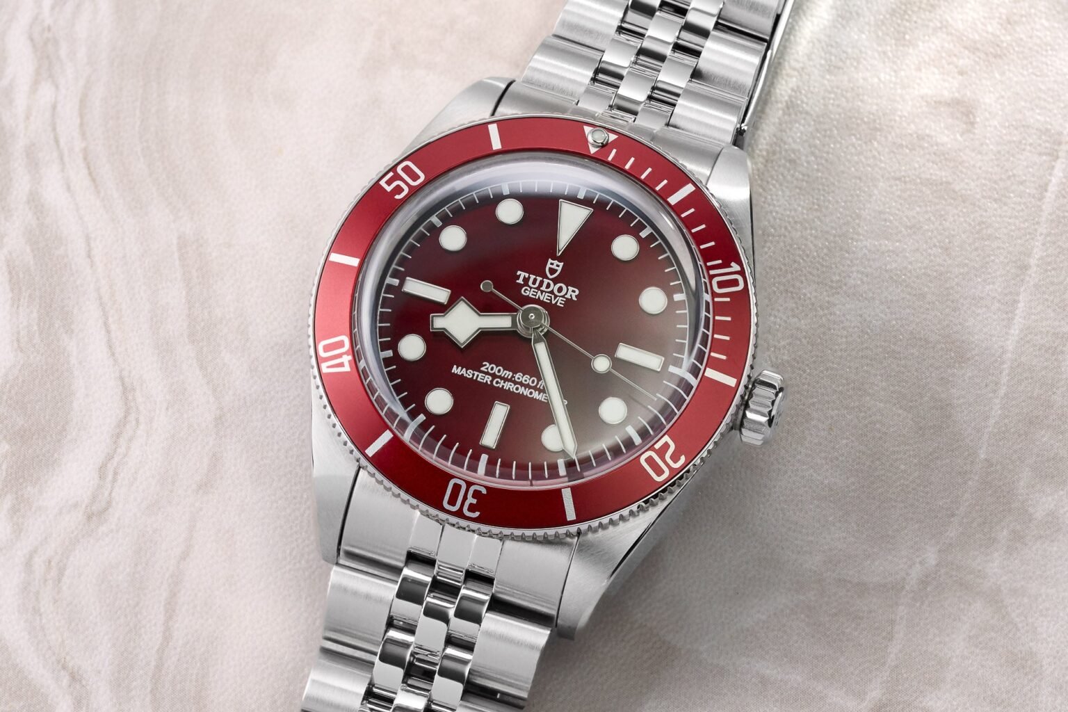 The collection has slowly iterated and improved over the years as all great watches tend to. We have seen new clasps with the T-Fit micro-adjustment, and the Black Bay 58 GMT received a Master Chronometer certification, which was a first for a 39mm watch in the family. So, naturally, we figured we would see these upgrades trickle their way down to the Black Bay 58 — which is exactly what we’ve gotten here. Burgundy is not a theme that we can say is new for Tudor, as the company has used the color since the beginning of the Black Bay’s story, with the initial 41mm Ref. 79220 showcasing the classic burgundy bezel. Then came the Black Bay 41 two years ago with an updated case. But still, as I mentioned earlier,  it was a 1990s Tudor Submariner never released to the public that demonstrated the bezel and dial combo in matching form.
