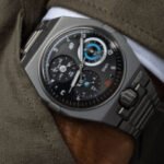 Paired with a sandblasted single-link titanium bracelet and titanium deployant clasp, the new Urwerk UR-10 SpaceMeter is priced at CHF 70,000. urwerk.com