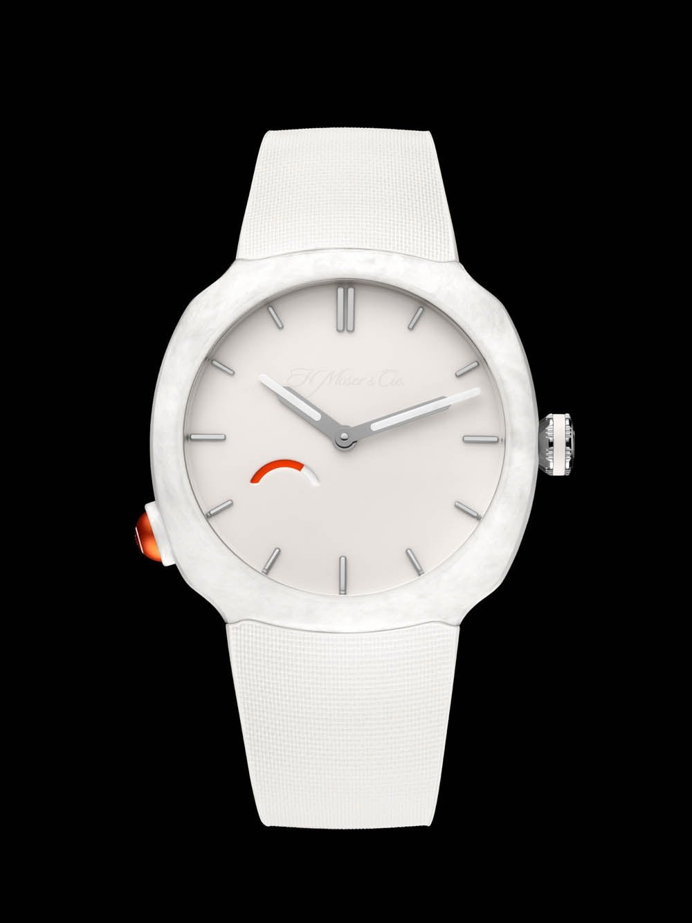 The case measures 40mm wide and 11.4mm thick, and is made from forged quartz. Unlike forged carbon, quartz fibre can be colored, so there’s a certain flexibility and freedom of design available with this material (white and black cases are available, 250 of each). According to Moser, cases are made by first cutting the quartz fiber into segments, compressing them in a mold, and combining with a resin material before a multi-step curing process. The result is a matte case, each with a unique moiré pattern. The movement is protected by a titanium inner case and allows for 100 meters of water resistance while taking advantage of the lightness of the quartz material.